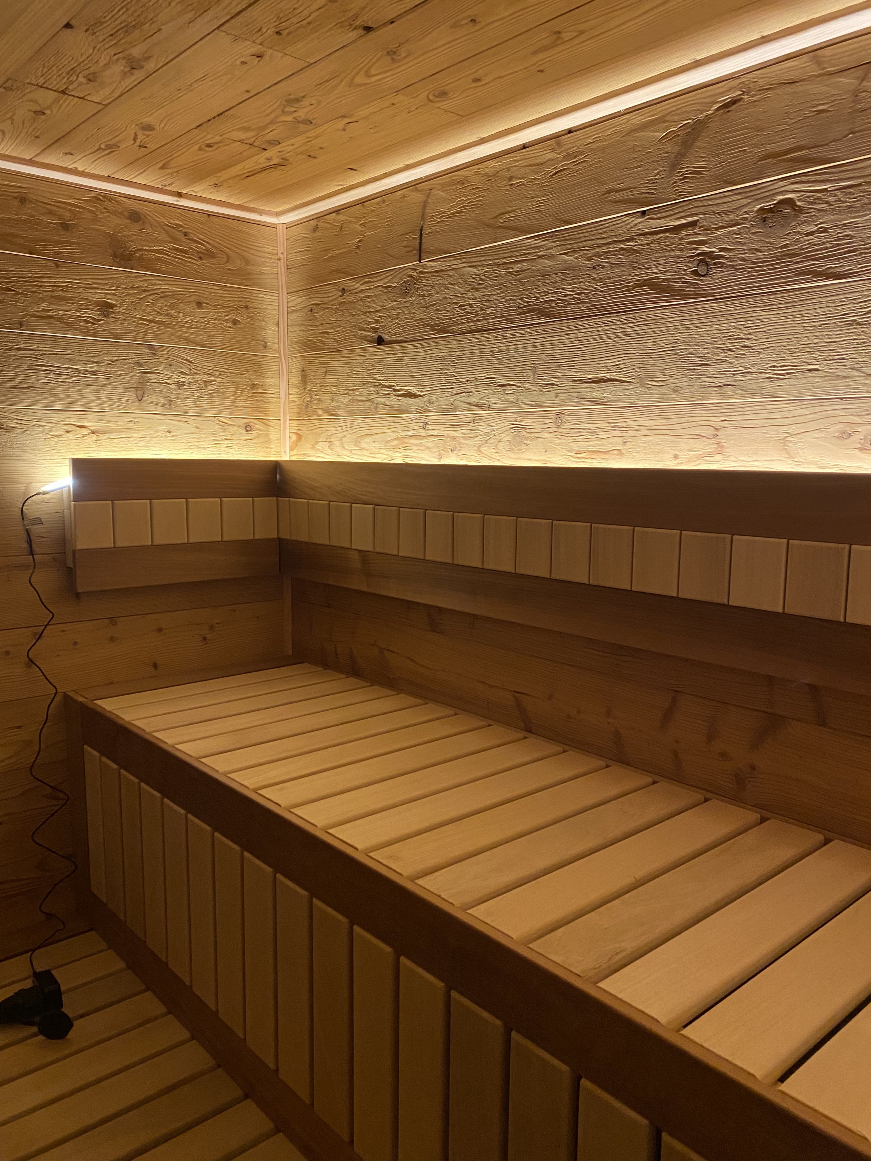 Wände aus Lärchenholz mit gehackter Oberfläche, Saunabänke im Wechselspiel zweier Holzarten und indirekte Beleuchtung haben diese Sauna in die Gegenwart geholt.
